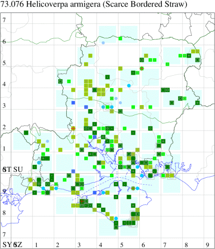 A moderately frequent immigrant from southern Europe, north to Shetland. In Hampshire and on the Isle of Wight recorded in small numbers in most years, although the outstanding migrant year of 2006 saw over 320 individuals recorded. Wingspan 30-40 mm. The main confusion species are
