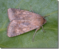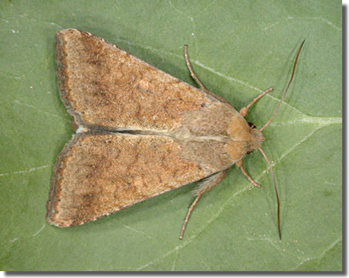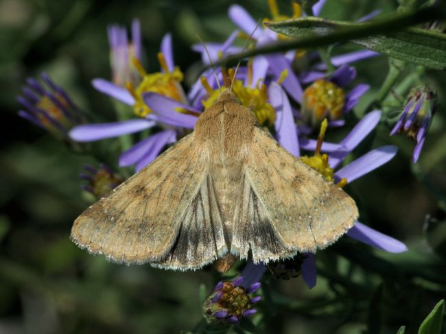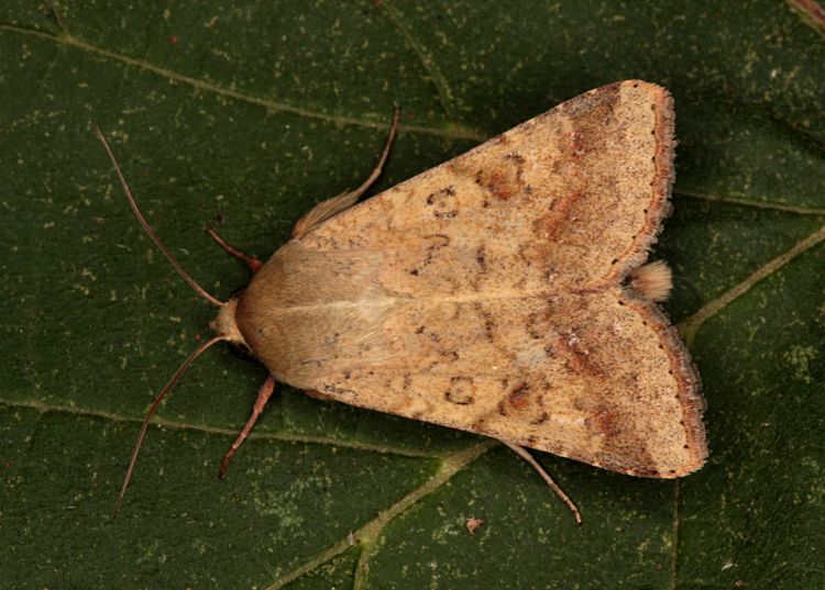 Eastern Bordered Straw Heliothis nubigera, which has forewing more mottled, subterminal band more indented, and pronounced marginal dots (MBGBI Vol 10). Larva polyphagous, most likely to be found in Britain on imported fruit and cut flowers, but in its native range can be of commerical importance damaging crops such as Tomato and Maize.