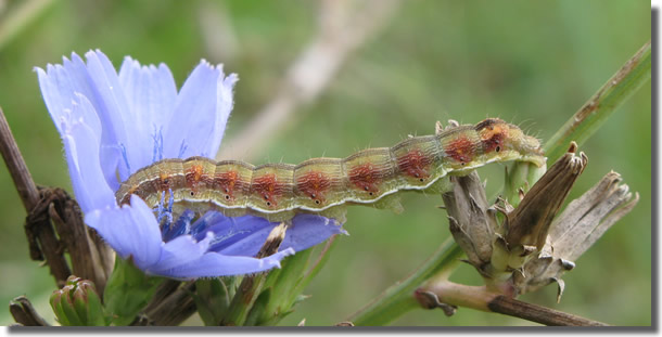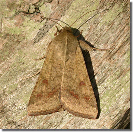 Bordered Straw Heliothis peltigera, which has forewing with a distinctive marginal dot above the tornus, and with reniform stigma usually joined to the costa by a dark triangular wedge, and