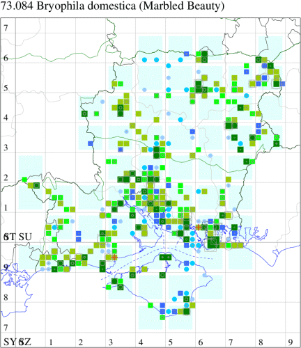 Common in orchards and woodland, and around old buildings, dry-stone walls and sea cliffs throughout the British Isles. Historically widespread and common in Hampshire and on the Isle of Wight, the 21st century has seen a significant decline in reporting rates: based on records received 2000-2023 this decline is in the region of 80-90%. The reason for this is unclear but may be at least in part due to competition with Tree Lichen Beauty which has increased dramatically in the same timeframe.Wingspan 23-31 mm. Dentate antemedian fascia extends from costa to dorsum, in contrast to superficially similar