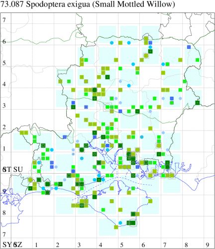 A common migrant from mainland Europe, appearing most frequently in southern coastal counties, less often inland and northwards to southern Scotland and the Inner Hebrides; recorded throughout Hampshire and the Isle of Wight. Wingspan 26-32 mm. The main confusion species are