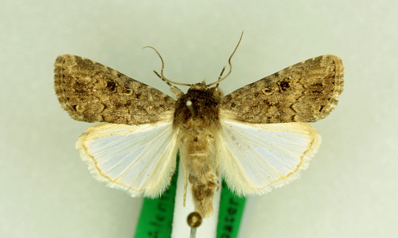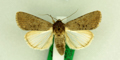Small Mottled Willow S. exigua, but reniform stigma darker, orbicular stigma comma-shaped, and holds its wings less tightly rolled around body. Larva feeds on various grasses; no evidence of breeding in the UK.