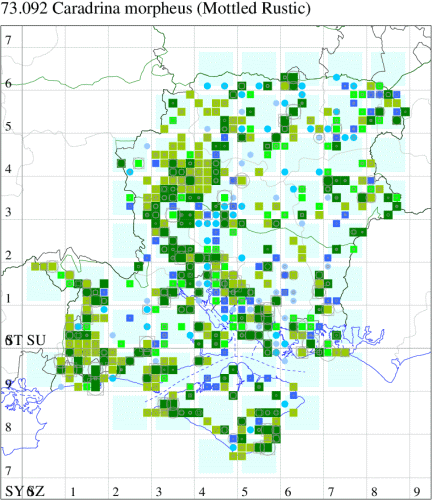 Common in a wide range of low-land habitats, including grassland, farmland, heathland, scrub, woodland and gardens throughout the British Isles, a species of conservation concern under the UK Biodiversity Action Plan. Widespread and common in Hampshire and on the Isle of Wight. Wingspan 28-35 mm. Characterised by orbicular and reniform stigmata appearing blurred, without distinct edges. Larva feeds on Stinging Nettle, Curled Dock, Broad-leaved Dock, Goosefoot and Hedge Bedstraw, over-wintering in a cocoon.