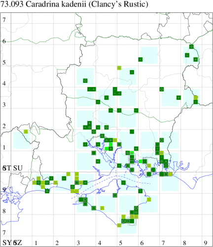 Increasingly common immigrant from southern Europe, appearing in southern England for the first time at New Romney, Kent, on 3 October 2002. Can now be found along the south coast, mostly in September and October, but occasionally as early as May. In our area first recorded in 2003, and 2006 saw a peak of 140 individuals in the southern two vice-counties: a further jump in numbers in 2018 has seen a subsequent exponential increase in records and it is increasingly frequent in the north of Hampshire. Wingspan 28-34 mm. On the continent, the larva feeds on various herbaceous plants.