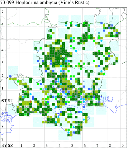 Rustic H. blanda, but less variable and often slightly smaller than these species, generally rather pale grey-brown, with relatively large orbicular and reniform stigmata, usually slightly darker than the ground colour, and usually distinctly white-edged. Larva feeds on various herbaceous plants, including Dandelion, Greater Plantain, Ribwort Plantain, Primrose and Prickly Lettuce.