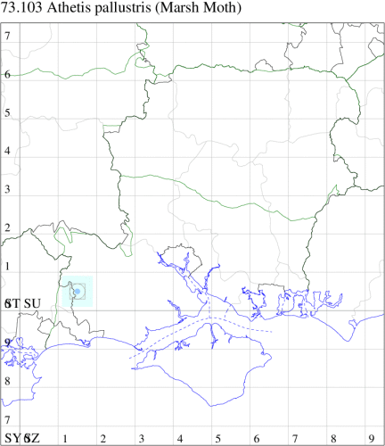 A rare Red Data Book species, in damp meadows in parts of north-eastern England, predominantly coastal, a priority species under the UK Biodiversity Action Plan. Formerly there were populations in Huntingdonshire, Cambridgeshire, Norfolk, Suffolk, Yorkshire and Cumbria, but the moth has not been seen in any of these counties since 1970. It is now confined to the coastal belt of Lincolnshire where it occurs on two nature reserves and possibly two additional sites. In Hampshire there is one ancient record of this species, a female taken flying by day at Ringwood in 1870. Not recorded from the Isle of Wight to date. Wingspan male 26-34 mm, female 18-22 mm. There is no other noctuid in Britain which bears any resemblance to Marsh Moth, however the pyralid