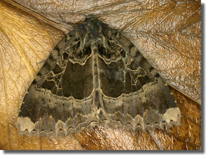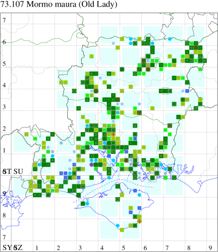 Local in marshes, gardens, hedgerows, scrub and woodland throughout much of the British Isles. In Hampshire and on the Isle of Wight is likely to be under-recorded, since it comes rarely to light, although it does come to sugar. Appears to favour watercourses through deciduous woodland, and is sometimes found roosting communally under bridges over streams. Wingspan 64-74 mm. Unmistakable. Larva feeds on various herbaceous and woody plants, such as Chickweed, Dock, Ivy and Hawthorn.