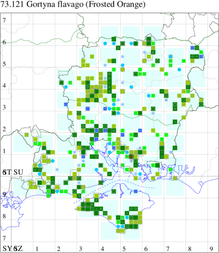 Common in rough grassland, woodland, waste ground, fens, marshes and gardens throughout much of the British Isles. In Hampshire and on the Isle of Wight fairly common, possibly increasing. Wingspan 32-42 mm. Larva feeds on various herbaceous plants, including Lesser Burdock, Greater Burdock, Foxglove, Creeping Thistle, Musk Thistle and Spear Thistle, over-wintering as an egg.