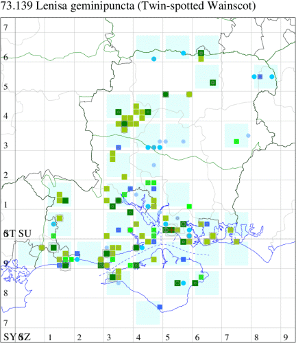 Local in reed-beds, marshes, fens and gardens throughout much of southern and eastern England, generally most frequent by the coast. In Hampshire and on the Isle of Wight locally abundant in reed-beds, especially those along the coast at Keyhaven, Lower Test and Titchfield Haven, and extending inland along the valleys of the Avon, Test and Itchen. Wingspan 28-37 mm. Characterised by the narrow reniform stigma, with a small white dot in each half, or sometimes only in dorsal half, and minute orbicular stigma (MBGBI Vol 10). Larva feeds on Common Reed, over-wintering as an egg.