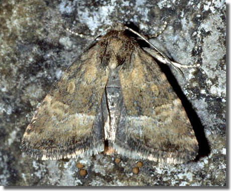 Cloaked Minor M. furuncula which is larger, with wingspan in excess of 21 mm; it has a relatively narrower forewing, is less glossy, and the postmedian line is very deeply bowed dorsal to the reniform stigma (MBGBI Vol 10). Larva feeds on Glaucous Sedge.