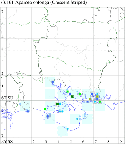 Nationally scarce (Nb) on saltmarshes, mud-flats, estuaries and brackish marshes, along the coasts of England and Wales. In Hampshire confined to the coastal salterns on the south coast and the Isle of Wight, where it is locally fairly common; its headquarters appear to be on Hayling Island. Wingspan 42-50 mm. Larva feeds on roots and lower stems of Common Saltmarsh-grass, Reflexed Saltmarsh-grass and Bulbous Meadow-grass.