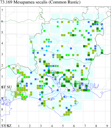 M. remmi in the 1980s, and individuals are mostly recorded as an aggregate of the three species. In Hampshire and on the Isle of Wight widespread, but since most