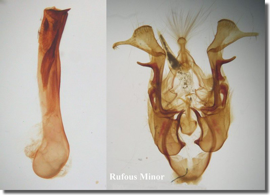 Tawny Marbled Minor O. latruncula, especially their melanic forms, can only reliably be separated by dissection of the genitalia. Typical examples of Rufous Minor have reniform stigma larger, fuller and rounder than in the other species, and often conspicuously pale against the dark median shade, and it may possible with experience to assign well-marked individuals to Rufous Minor at a particular site once the observer is familiar with the forms present in that area. Larva feeds on various grasses.