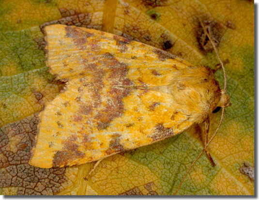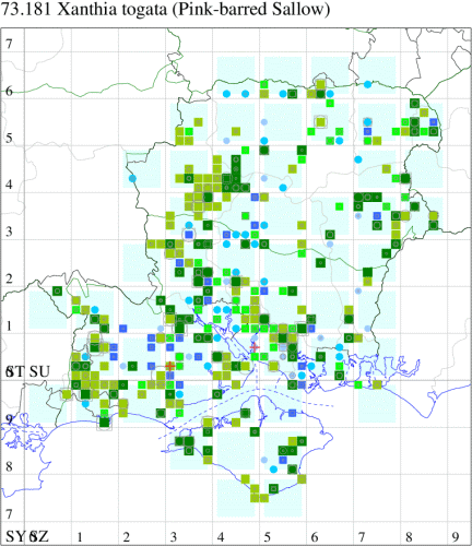 Common in broad-leaved, often damp, woodland, marshes, fens, heathland and gardens throughout the British Isles; frequently recorded and well distributed across much of Hampshire and the Isle of Wight. Wingspan 29-37 mm. Easily distinguished from other superficially similar autumnal sallows by the distinctive purple head and patagium. Larva feeds on catkins of Sallow and Poplar, over-wintering as an egg
