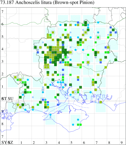 Common in broad-leaved woodland, parkland, heathland, fens, scrub, hedgerows and gardens throughout the British Isles, a species of conservation concern under the UK Biodiversity Action Plan. Widespread and moderately common in Hampshire but scarce on the Isle of Wight, with only two records so far this century. Wingspan 32-39 mm. The main confusion species is