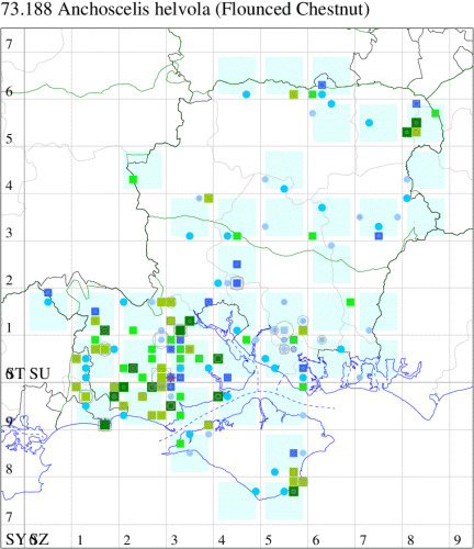 Local in broad-leaved woodland, scrubby downland, heathland and moorland, and a species of conservation concern under the UK Biodiversity Action Plan. In Hampshire and on the Isle of Wight present in all three vice-counties, but usually at low density and mainly in deciduous woodland. Very rare away from the New Forest, but possibly under-recorded due to a late flight period. Wingspan 35-45 mm. Larva feeds on Sessile Oak, Pedunculate Oak, Wych Elm, English Elm, Silver Birch, Downy Birch, Eared Willow, Goat Willow, Grey Willow, broad-leaved trees, Heather and Bilberry, over-wintering as an egg.