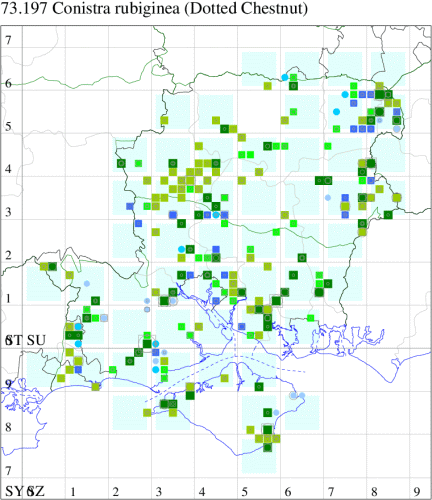 Nationally scarce (Nb) in woodland, wooded heathland, farmland and hedgerows in parts of England, most commonly in the south-west; increasing. In Hampshire this species appears to have become much more widespread in recent years, though still at low density: up until the 1970s, its stronghold was on the Bagshot Sands area in the north-east, but recently there have been records from across the county. On the Isle of Wight, it remains distinctly uncommon, but two in 2009 hint at an increase. Wingspan 34-40 mm. Larva feeds on Apple.