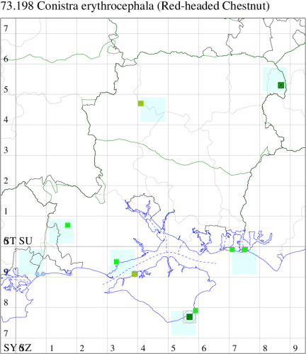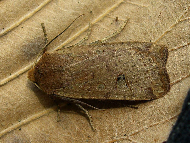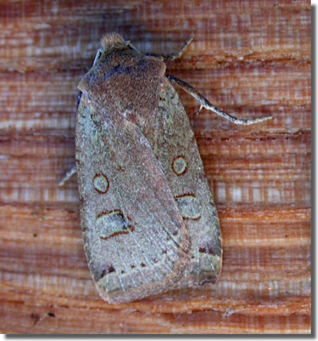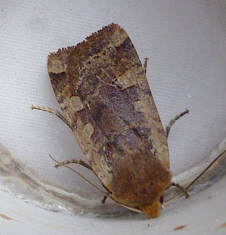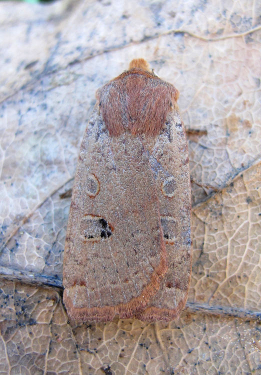 Chestnut Conistra vaccinii by the two or three separated dark dots at base of reniform stigmata, which are diagnostic for the species (MBGBI Vol 10). Larva feeds on the buds of Oak, Elm and Hornbeam, then later on various herbaceous plants, including Dandelion, Ribwort Plantain and Bedstraw, very limited evidence of breeding in the UK.