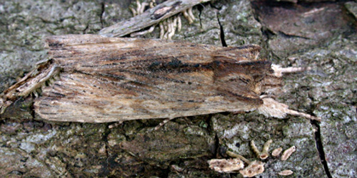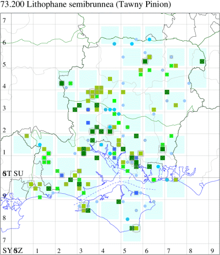 Local in broad-leaved woodland, parks and gardens throughout much of southern England; in Hampshire and on the Isle of Wight, occurs at very low density throughout, the majority being taken at light after hibernation. Wingspan 40-44 mm. The main confusion species is Pale Pinion L. hepatica, especially dark forms, but the forewing is less narrow, with slightly arched costa and no black pre-tornal streak (MBGBI Vol 10). Larva feeds on Ash.