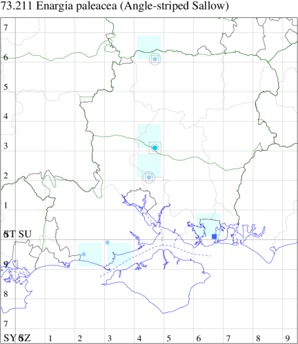 Orange Sallow Xanthia citrago (MBGBI Vol 10), which is much smaller, has the antemedian fascia faint, without sharp angulation, and the median fascia dark, broad and conspicuous. Larva feeds on Silver Birch, Downy Birch and Aspen, over-wintering as an egg.