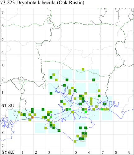 This species was found in Jersey in 1991 and is now established on Evergreen (Holm) Oak in the Channel Islands. First recorded in Britain at Freshwater, Isle of Wight, on 15 October 1999, and now annual in Freshwater and Ventnor in reasonable numbers, although only one confirmed larval record exists, from Fort Victoria in 2006; subsequently appearing in mainland Hampshire on 15 October 2005, and increasingly thereafter along the south coast: there have been two larval records to 2015. Wingspan 30-32 mm. The main confusion species are certain forms of
