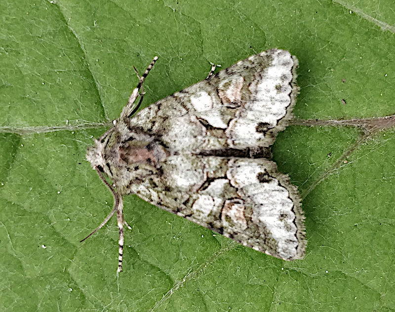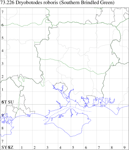 Brindled Green D. eremita but greener and lacking the sharply demarcated and dentate subterminal line of that species, with a broad, pale terminal band and prominent dark tornal spot. Larva feeds on Oak, no evidence of breeding in the UK.