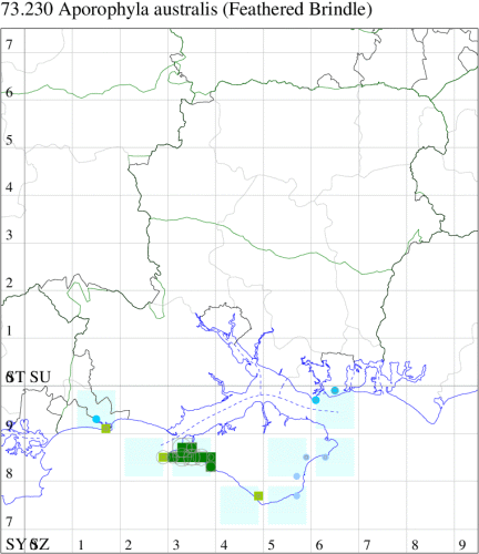 Nationally scarce (Nb) on shingle beaches, sand-dunes and sea cliffs, along the coasts of southern and south-eastern England from Cornwall to Suffolk and, locally, on the southern slopes of the South Downs. On the Isle of Wight, common on the Freshwater cliffs. In Hampshire there have been two records, at Southsea in September 1988, and Hengistbury Head (in the Dorset section of vice-county 11) in October 1996. Wingspan 36-42 mm. The dark form