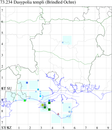 Local on grassland, sea cliffs, sand-dunes, upland grassland, moorland and sand-dunes throughout much of Scotland, northern England and south-western England, predominantly coastal, a species of conservation concern under the UK Biodiversity Action Plan. The species is almost entirely coastal in southern England, but it occurs also inland from the north Midlands northward; in the southern part of the range it is always found in association with rocks, but further north it is more generally distributed, and in Scotland becomes progressively more common from south to north, abundant in Orkney and Shetland (MBGBI Vol 10). In Hampshire and on the Isle of Wight there is an established population in the Freshwater area of the Island, and a scattering of records in south-west Hampshire. Wingspan 40-56 mm. Larva feeds on Hogweed and Wild Angelica.