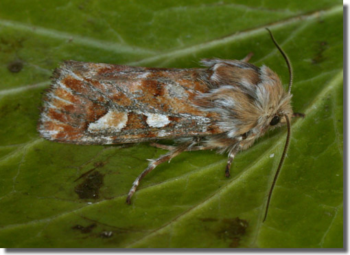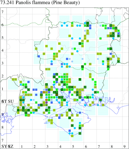 Common in coniferous and mixed woodland, plantations, parks and gardens throughout the British Isles. Widespread and fairly common in Hampshire and on the Isle of Wight. Wingspan 32-40 mm. Unmistakable. Larva feeds on needles of Scots, Corsican, Lodgepole and Maritime Pine.