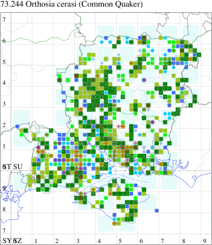 Common often abundant, in a wide range of low-land habitats, including woodland and gardens throughout the British Isles. Widespread and common in Hampshire and on the Isle of Wight. Wingspan 34-40 mm. A very common early spring visitor to light traps, distinguished from the equally common