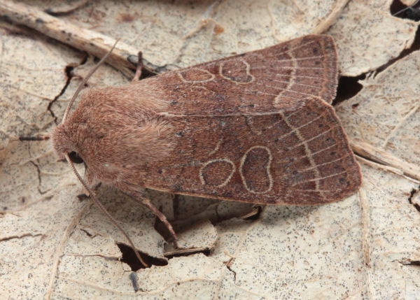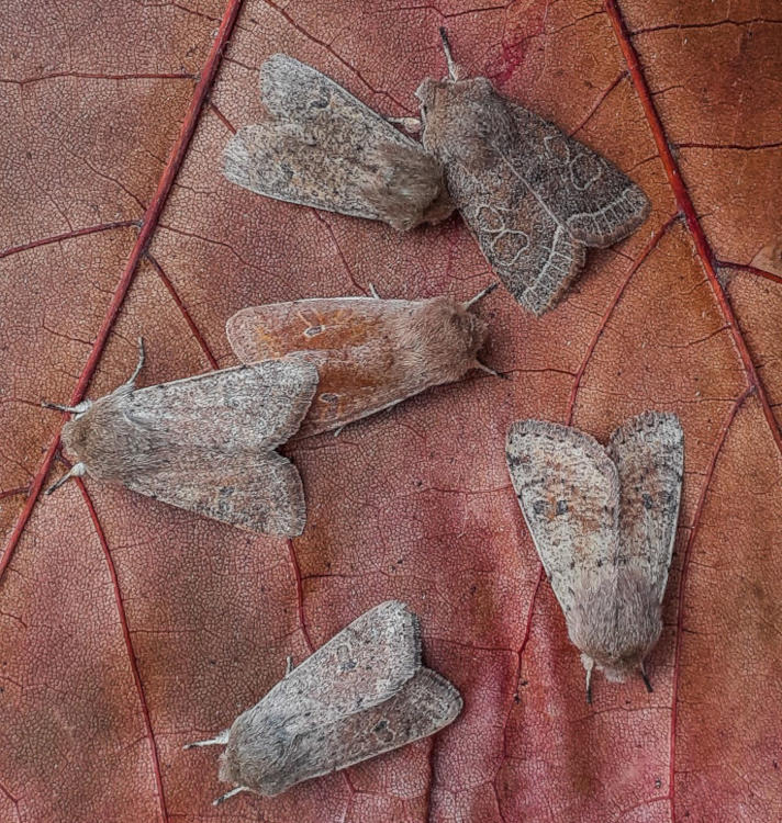 Blossom Underwing O. miniosa by its complete and pale, upper stigmata clearly outlined whitish, median fascia, when present, narrow and dark, and hindwing fuscous (MBGBI Vol 9). Larva feeds on various herbaceous trees and shrubs, including Oak, Sallow, Birch, Elm, Hawthorn and Hazel, over-wintering as a pupa.