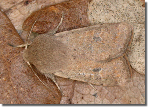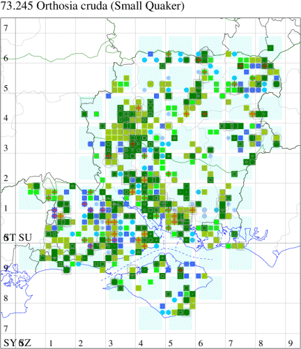 Common in broad-leaved woodland, areas with scattered trees and heathland throughout the British Isles. Widespread and extremely common in Hampshire and on the Isle of Wight, especially during warm dry springs. Wingspan 28-32 mm. A very common early spring visitor to light traps, where the small size and relatively small orbicular stigma easily distinguishes