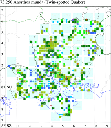 Common in broad-leaved woodland and gardens throughout England and Wales. Widespread and common in Hampshire and on the Isle of Wight. Wingspan 38-44 mm. Larva feeds on Sessile and Pedunculate Oak, Sallow, Aspen, Field Maple, Ash, Honeysuckle and Hop, over-wintering as a pupa.