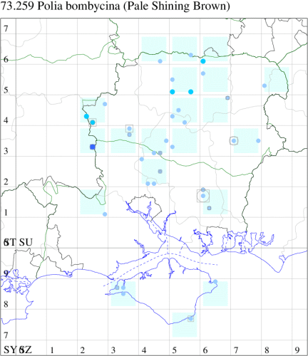 Nationally scarce (Nb) in rough grassland, scrubby grassland, scrubby downland, open woodland and chalk and limestone districts in parts of southern England, a priority species under the UK Biodiversity Action Plan. In Hampshire and on the Isle of Wight once locally common, this species has virtually disappeared from the county, and we have received no record since 1990. The ecology is little understood and, alarmingly, recent attempts to find the species on Porton Down where it was once common, and where the habitat appears to be unchanged, have proved negative. Wingspan 47-52 mm. Fairly unmistakable. Larva feeds on deciduous trees and shrubs and herbaceous plants.