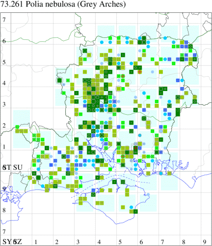 Common in broad-leaved woodland, areas with scattered trees and gardens throughout the British Isles. Widespread and still fairly common in Hampshire. Not recorded from the Isle of Wight since 1983. Wingspan 46-58 mm. The main confusion species is