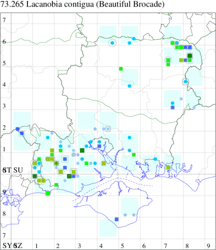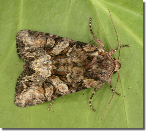 Pale-shouldered Brocade L. thalassina. Larva feeds on Birch, Oak, Broom, Bog-myrtle, Heather, Dyer's Greenweed and Bramble, over-wintering as a pupa.