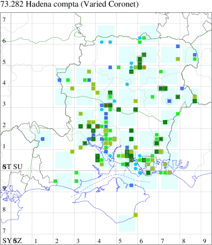 Marbled Coronet H. confusa which is larger, with more ample forewing, median fascia incomplete, diagonal, from orbicular stigma to tornus, and whitish blotches at each extremity of subterminal line (MBGBI Vol 9). Larva feeds on seedpods of Bladder Campion and, in gardens, Sweet-William, over-wintering as a pupa.