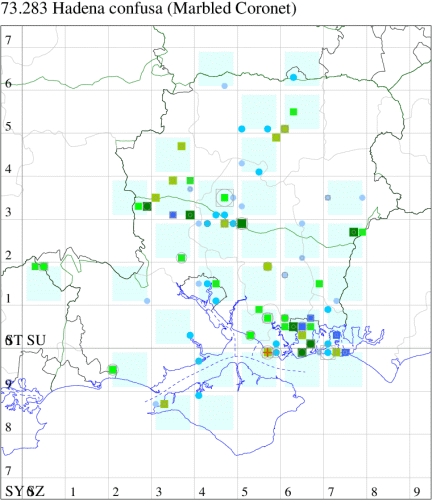Local on calcareous grassland in southern England and along the coasts of Britain and Ireland. In Hampshire and on the Isle of Wight it has never been a common species, but still a sporadic visitor to light almost anywhere, although distinctly uncommon in the New Forest. Wingspan 33-39 mm. The main confusion species is