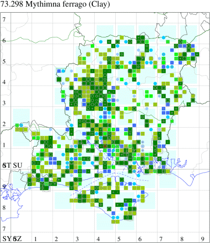 Common in a wide range of habitats, including gardens, marshes, river-banks and open woodland throughout the British Isles. Widespread and common in Hampshire and on the Isle of Wight. Wingspan 36-44 mm. Similar to White-point M. albipuncta, and sharing that species' black blotch on abdomen of male, but larger and plainer. Larva feeds on various grasses, including Annual, Smooth and Wood Meadow-grass, and Cock's-foot.