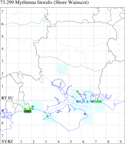 Nationally scarce (Nb) in sand-dunes and on sandy beaches in parts of England, Wales and southern Scotland, predominantly coastal. In Hampshire and on the Isle of Wight locally common on coastal sand-dunes, especially those in south Hayling Island. Wingspan 36-42 mm. A relatively well-marked and distinctive wainscot. Larva feeds on Marram-grass.