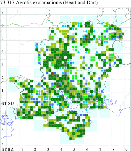 Common often abundant, in all types of habitat throughout the British Isles. Widespread and very common in Hampshire and on the Isle of Wight. Wingspan 35-44 mm. The presence of the dark mark on the patagia distinguishes Heart and Dart from the occasional female Heart and Club A. clavis which resembles it (MBGBI Vol 9). Larva feeds on herbaceous plants such as Ribwort Plantain and Fat-hen.