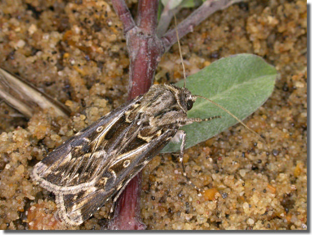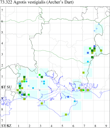 Local on sand-dunes, all around the coasts of the British Isles, and on heaths inland in southern England. In Hampshire frequent on the sand-dunes of Hayling Island, less so in other coastal localities; still found in small numbers in the New Forest and on the eastern heaths of North Hampshire. There have only been three recent record from the Isle of Wight, in 1995, 2011 and 2013. Wingspan 30-40 mm. The most distinctive and easily recognised of the Agrostis species. Larva feeds on herbaceous plants such as Lady's Bedstraw, Hedge Bedstraw, Heath Bedstraw and Greater Stitchwort.