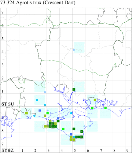 Local on sea cliffs and rocky areas by the sea, from the Isle of Wight westwards to north Wales. In Hampshire and on the Isle of Wight found mainly on the coasts of the Island, where it is locally common. Very rare on the mainland, but occasional wanderers have been found some distance inland. Wingspan 35-42 mm. Quite variable, with specimens from the Isle of Wight larger and paler than elsewhere in Britain; resembles Turnip Moth A. segetum and Heart and Club A. clavis, as well as the rare immigrant Great Dart A. crassa. Larva feeds on Rock Sea-spurrey and Thrift.