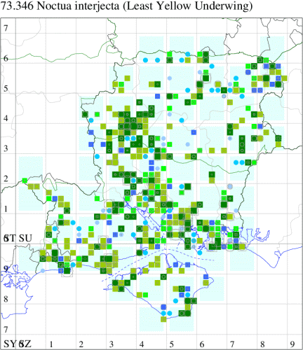 Common in hedgerows, gardens, fens, sand-dunes and other open areas throughout England and Wales. Widespread and fairly common in Hampshire and on the Isle of Wight. Wingspan 31-36 mm. The least frequent of the five common Noctua species. Larva feeds on various grasses, and herbaceous plants such as Meadowsweet, Common Mallow and Hawthorn.