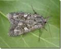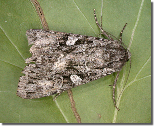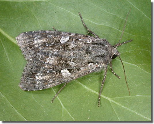 Grey Arches Polia nebulosa, which flies at the same time and in similar habitats to the resident populations, but this has the orbicular stigma rounded, the reniform stigma less excavated, and hindwing paler with a dark marginal line before the cilia (MBGBI Vol 9). Larva feeds on Bog-myrtle.