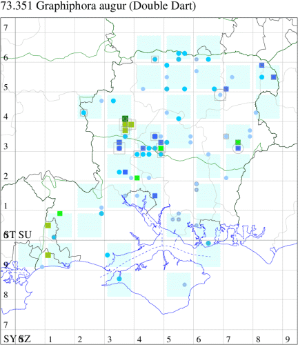 A species of conservation concern under the UK Biodiversity Action Plan. Occurs in broad-leaved woodland, scrub, hedgerows, parks, marshes, river-banks, damp areas, fens and gardens throughout much of the British Isles, In Hampshire and on the Isle of Wight historically widespread in the mainland vice-counties, but seldom common; it is found in open woodland and bushy places on and off the chalk, but has decreased considerably and recent records have centered on the Test valley with occasional records from the border with Dorset in the south-west. Wingspan 38-48 mm.