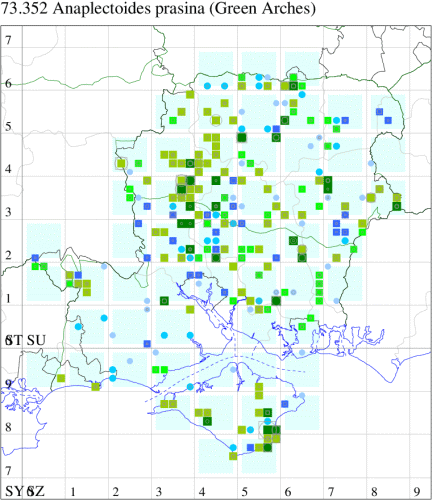 Common in broad-leaved, especially damp, woodland throughout the British Isles; widely distributed in Hampshire and the Isle of Wight, but rarely numerous, with no evidence of any real decline. Wingspan 43-53 mm. Larva feeds on numerous herbaceous and woody plants, including Primrose, Knotgrass, Sallow, Dock, Honeysuckle, Bramble and Bilberry.