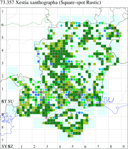 Common in grassland, gardens and woodland rides throughout the British Isles. In Hampshire and on the Isle of Wight abundant in areas of grassland and open woodland, and amongst the rank grasses of the chalk downs. Wingspan 32-40 mm. The pale reniform stigma of Square-spot Rustic should preclude confusion with any other species; the much less common