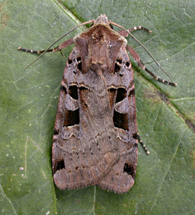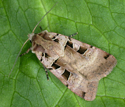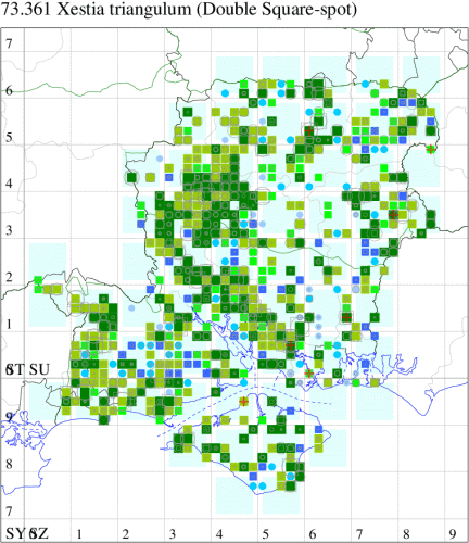 Common in deciduous woodland, hedgerows and gardens throughout the British Isles, where it is far more frequent than the superficially similar Triple-spotted Clay X. ditrapezium. Widespread and common in Hampshire and on the Isle of Wight. Wingspan 36-46 mm. Larva feeds on Meadow Buttercup, Primrose, Cow Parsley and Wood Spurge.