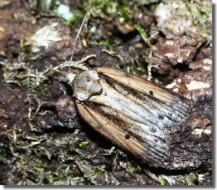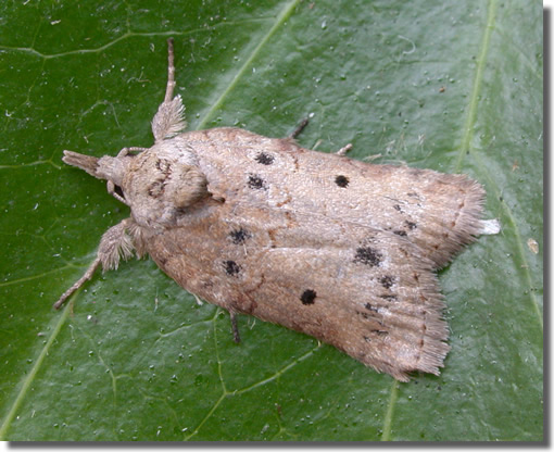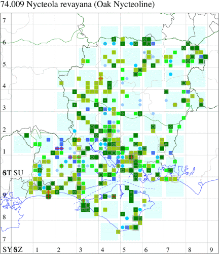 Local in broad-leaved woodland, parks and gardens throughout much of the British Isles. In Hampshire and on the Isle of Wight widely distributed in oak and mixed deciduous woodland. Turns up at light both before and after hibernation; in autumn it visits the flowers of ling and during the winter it may be beaten from yew trees in woodland, and from thickets of blackthorn. Wingspan 22-28 mm. Very variable, with some eight distinct forms, and most likely to be passed over as a micromoth of the Tortricidae, especially